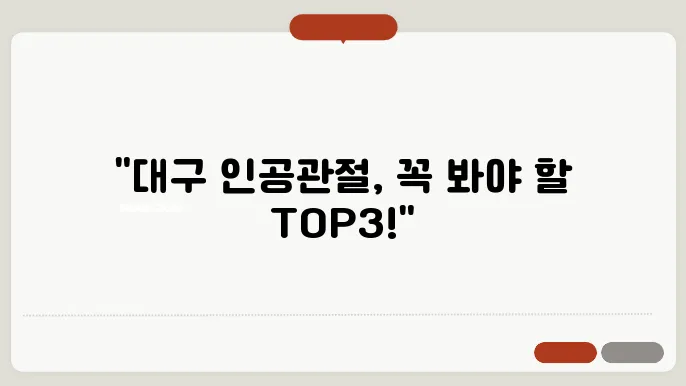 | 대구 관절 치료 센터 | 15년 이상 경력의 전문의, 체계적인 재활 프로그램 | 4.8/5.0 | 수술 후 관리에 뛰어난 평판, 재활 지원센터 운영 |