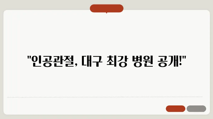 | 대구 신경외과 병원 | 전문적인 인공관절 수술 팀 보유, 최신 장비 사용 | 4.7/5.0 | 환자 만족도 높은 평가, 재수술 확률 낮음 |