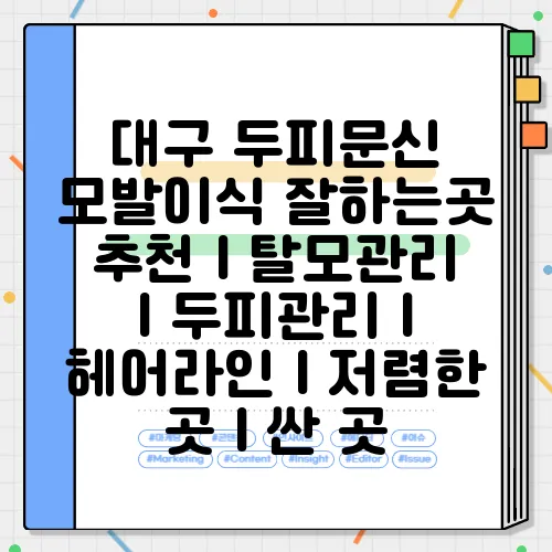 대구에는 '두피명가'와 '탈모클리닉 D'와 같은 저렴한 두피 관리샵이 있습니다. 이들 곳은 합리적인 가격으로 두피 관리 패키지를 제공하며, 초보자부터 전문 관리까지 다양한 프로그램을 수행하고 있습니다. 이용전 반드시 상담을 받아보시고 자신의 상황에 맞는 서비스를 선택하는 것이 중요합니다.