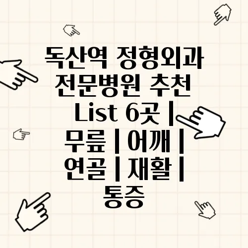 독산역 주변에는 다양한 정형외과 전문병원이 있습니다. 추천할 만한 병원으로는 1) 넷마리 병원, 2) 서울연합 정형외과, 3) 동탄 맥스병원, 4) 삼모 병원, 5) 신경외과 병원, 6) 메디라인 정형외과가 있습니다. 각각의 병원은 무릎, 어깨, 연골 및 통증 재활에 특화된 진료를 제공하니 필요에 따라 선택하시면 좋습니다.