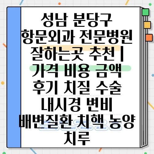 | 성남항문외과 | 치핵, 치루, 농양 치료 전문 | 50만원 ~ 100만원 | 정확한 진단과 친절한 상담으로 긍정적인 후기가 많음 |