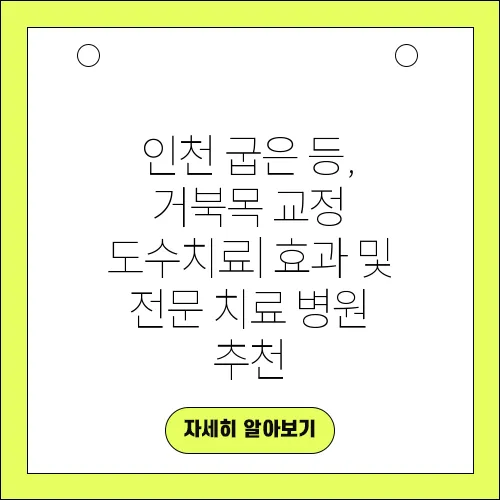 인천 지역에서 굽은 등과 거북목 치료를 전문으로 하는 병원으로는 '인천 재활병원'과 '신성병원'을 추천합니다. 두 병원 모두 전문 치료사들이 상주하며, 개개인에 맞춘 체계적인 도수치료 프로그램을 제공하고 있습니다. 또한, 환자 만족도가 높은 것으로 알려져 있으므로 상담 후 치료를 받는 것이 좋습니다.