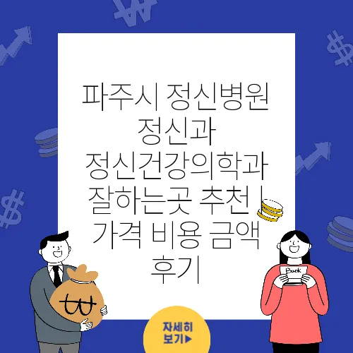 | 파주정신병원 | 종합정신의학 서비스를 제공하며, 입원 치료와 외래 진료 모두 가능 | 입원 치료 1일: 약 10만원, 외래 진료: 약 5만원 | 전문 정신과 의사들로 구성된 의료진, 다양한 치료 프로그램 운영 |